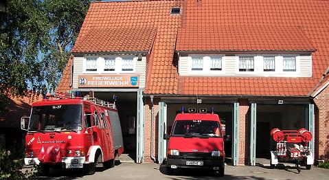 Der "Fuhrpark" der Feuerwehr Hechthausen. Der Anhänger steht eigentlich angehängt hinter dem MTW.